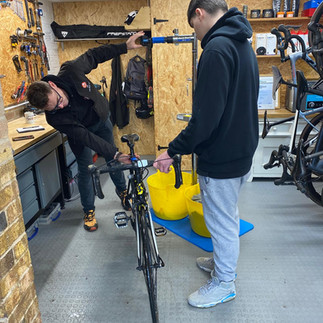 During his first session Kye helped Jim with a Standard Assessment Service (SAS) on a customer's racing bike. Kye followed the service plan by firstly washing down the bike, then placing it in the stand to check the tyres, spokes, chain and indexing. Following the checks, Kye and Jim worked together to replace the chain and bar end plugs and indexed the bike's front gear.