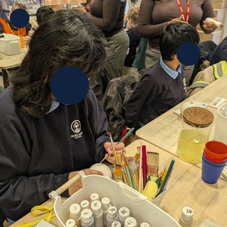 The helpful Studio staff explained to the pupils and staff what they needed to do to achieve the best results (3 coats of paint is optimal) and then the class chose their paint colours, brushes and sponges to create their Christmassy designs.